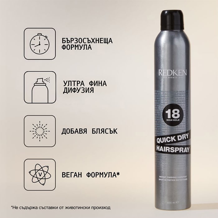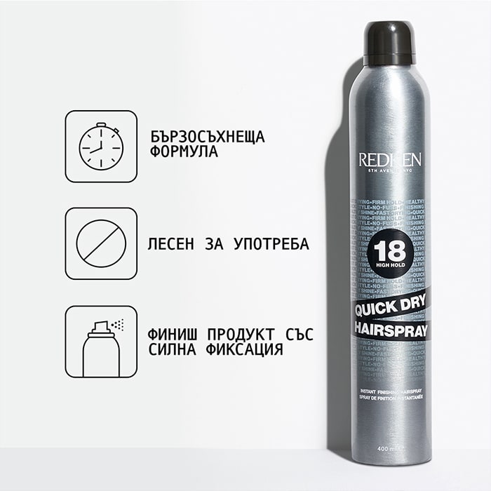 Устойчив и бързосъхнещ лак за коса Redken Quick Dry Hair Spray осигурява силна фиксация с дълготраен ефект. Супер леката и бързосъхнеща формула незабавно попива в косъма и перфектна структура на стайлинга. Лакът не оставя следи и не води до дискомфорт при допир на прическата. Добавя блясък към оформената прическа. Крайният резултат е добре фиксирана визия с блясък, устойчива на влага и фриз през целия ден.