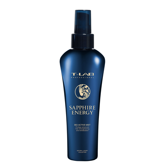 Биоактивен спрей за коса анти-ейдж T-LAB Sapphire Energy Bio-Active Mist подхранва косата, благодарение на добавената в състава скъпоценна сапфирена пудра. Поддържа оптималните нива на хидратация в косъма, възстановява и ревитализира увредената и суха коса. Сапфирената пудра допринася за здравината и блясъка на косата, като я прави мека, гладка и сияйна.