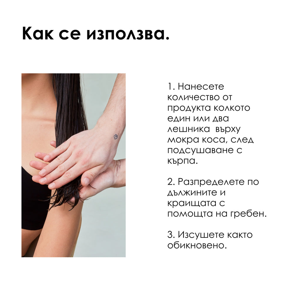 Начин на употреба: Нанесете от продукта върху чиста и подсушена коса. Оставете да изсъхне, ако желаете по-прибран вид на косата, или оформете със сешоар. За по-добро разпределяне използвайте четка и разрешете.