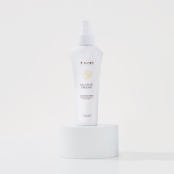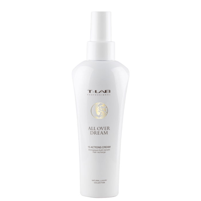 Kрем за коса 15 в 1 T-LAB All Over Dream 15 in 1 Cream подхранва, намалява наелектризирането на косата, има анти фриз ефект и осигурява мощна защита при термообработка и срещу UVA/UVB лъчи. Създаден с 15 активни органични и иновативни съставки, кремът за коса 15 в 1 улеснява разресването, оформянето и стилизирането. Спомага за укрепването и предпазването на косъма от външните агресори на околната среда. Съдържа 98,1% натурални съставки.