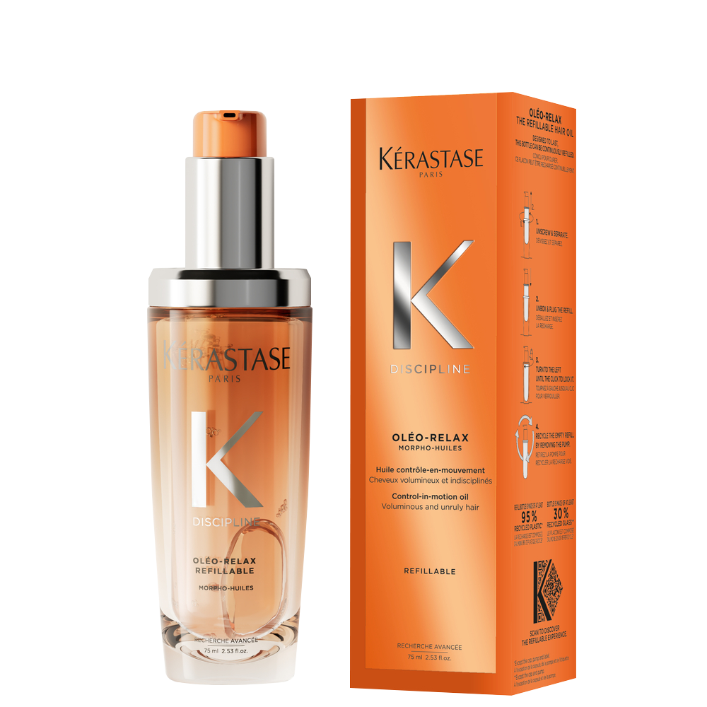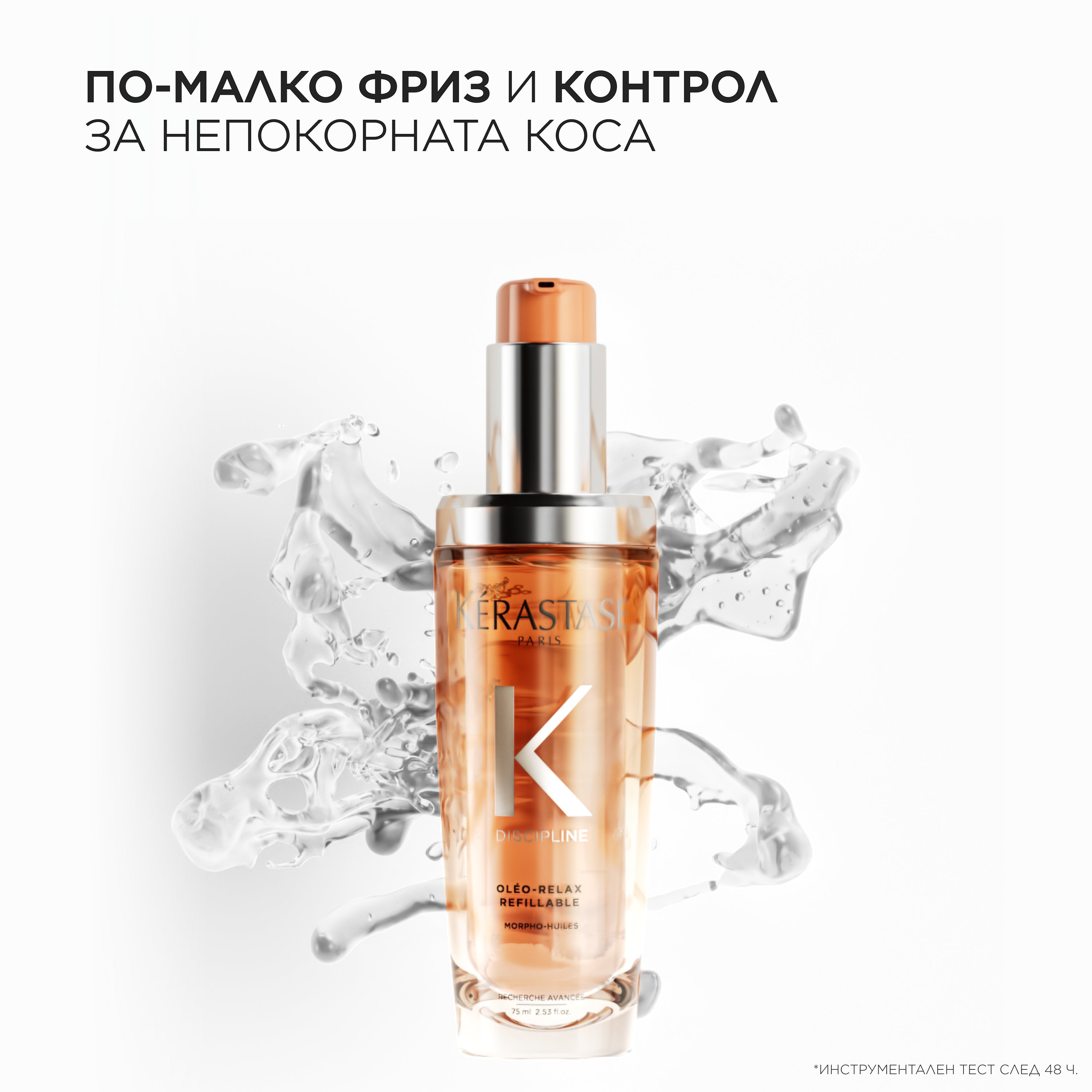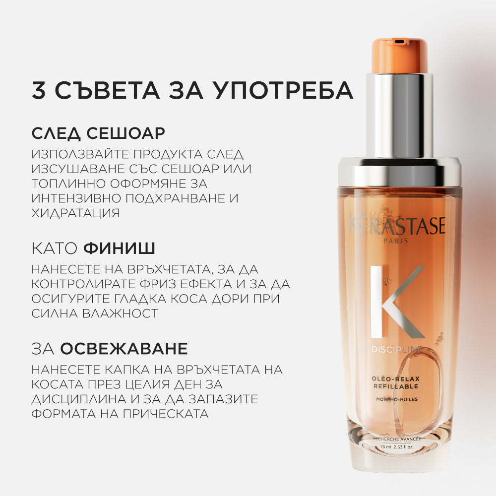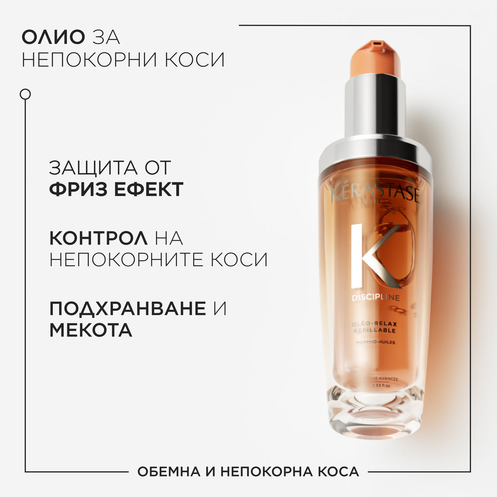 Олио за изглаждане и контрол на непокорната и обемна коса с възможност за смяна на пълнителя.