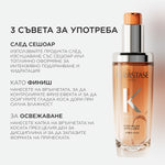 Начин на употреба: Нанесете 1 или 2 помпи на влажна или суха коса като грижа без изплакване. Започнете от средата, дължините и преминете към краищата. Оформете косата по желание. Може да се използва като олио за коса след изсушаване с топлинни инструменти, както и за да добавите подхранване и мекота през целия ден.