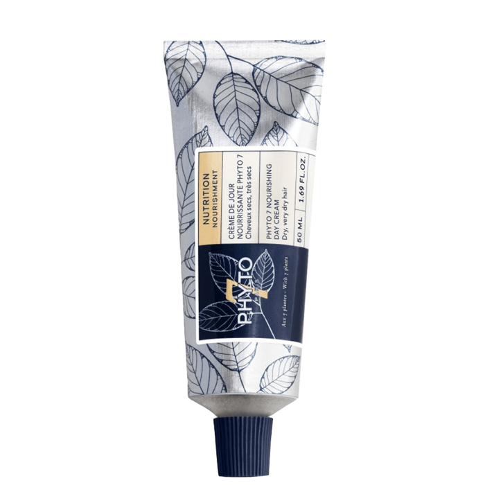 Кремът за суха коса PHYTO 7 Nourishing Day Cream подхранва косъма в дълбочина, без да утежнява допълнително косата. Улеснява оформянето и стилизирането ѝ. Съдържа 7 растителни екстракта, благодарение на които косата е по-мека, подхранена и изгладена. Не съдържа силикони и оцветители.
