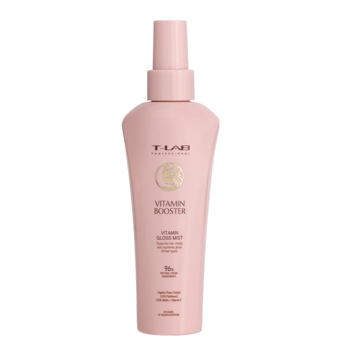 Подхранващ спрей за блясък с витамин-комплекс T-LAB Vitamin Booster Vitamin Gloss Mist осигурява на косата ефективно и интензивно подхранване, омекотява и възстановява. Подходящ за всеки тип коса и скалп. Съдържа активни органични съставки, които укрепват косъма и успокояват скалпа, правейки косата гладка и мека. Съдържа екстракт от органична роза, богат на витамини А, С и Е. Съдържа 96% натурални съставки.