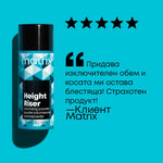 Стайлинг пудрата Matrix Height Riser придава незабавен обем и осигурява допълнителна фиксация. Малко количество от пудрата е достатъчно, за да осигури текстура и плътност на стайлинга. Повдига косата от корените и създава атрактивен обем при всеки тип коса и прическа. Не слепва косъма и оставя косата жизнена, с възможност за гъвкаво естествено движение. Придава мек и копринен завършек, без да оставя видими следи и бели петна.