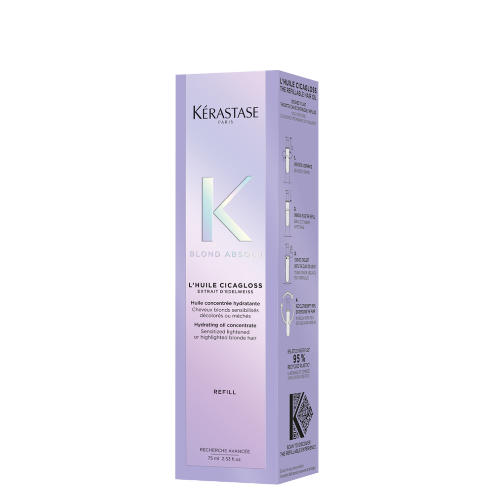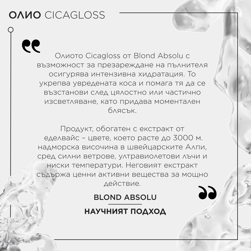 Използвайте, за да презаредите интензивно озаряващо олио Cicagloss от Blond Absolu. Осигурява интензивна хидратация, укрепва увредената коса и помага за възстановяването на косата след изсветляване. Придава мигновен блясък. Продукт, обогатен с с хиалуронова киселина и екстракт от еделвайс – цвете, което расте до 3000 м. надморска височина в швейцарските Алпи, сред силни ветрове, ултравиолетови лъчи и ниски температури. Съдържа ценни активни вещества за мощно действие. В опаковка, направена от 95% рециклирана пластмаса.