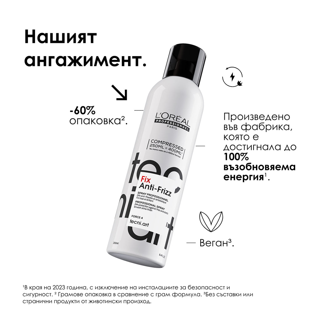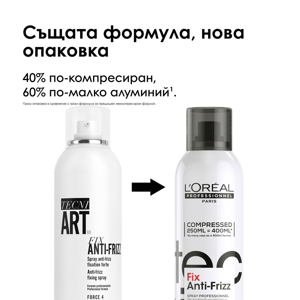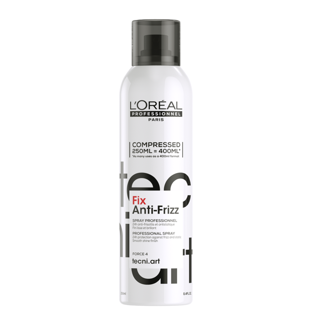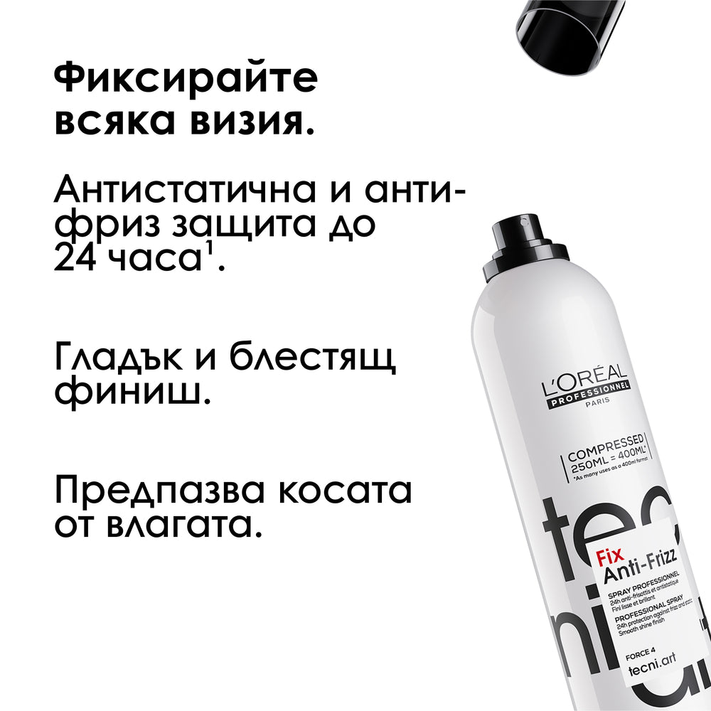 Фиксиращ анти-фриз спрей L'Oreal Professionnel Tecni Art Fix Anti-Frizz. Професионален спрей за 24 часа контрол на фриз ефекта*, обогатен с фиксиращи съставки, силно задържащи смоли. Предпазва от разваляне и начупване на прическата и осигурява 24-часова защита от влагата. Перфектен за укротяване на непокорни коси.