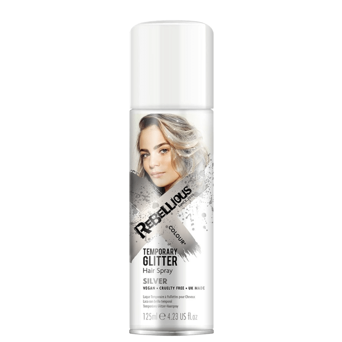 Rebellious Colour Temporary Glitter Hair Spray Silver е спрей, който покрива косата с воал от блестящи сребристи частици, създавайки неотразима и бляскава визия. Той има фиксиращ ефект, като не утежнява косата. Може да се напръска върху цялата коса или на отделни кичури. Идеален е както за специални събития и партита, така и за моментите, когато искате да добавите малко блясък към ежедневния си стайлинг. Нанася се лесно и издържа до следващото измиване.