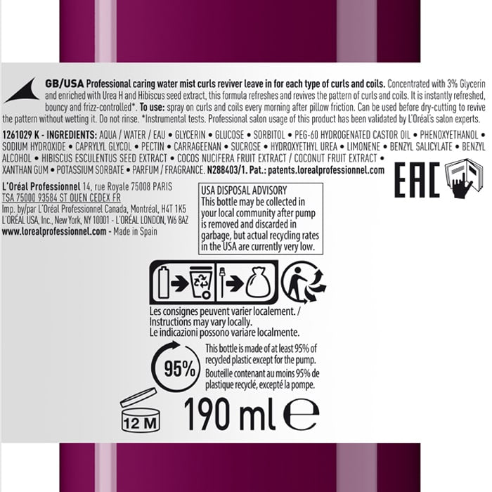 Начин на употреба: Използвайте, за да освежите къдриците си всяка сутрин. За еластични къдрици нанесете обилно с намачкващо движение, след като напръскате на разстояние от около 20 см от косата.