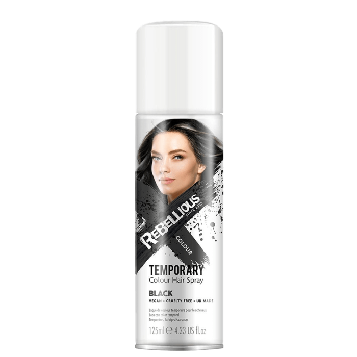 Rebellious Colour Temporary Colour Hair Spray Black е спрей в черен цвят, с който лесно може да създадете малки цветни кичури или да оцветите цялата коса. Той има фиксиращ ефект, като не утежнява косата. Идеален е за постигане на креативна и цветна визия. Подходящ е както за специални събития и партита, така и за моментите, когато искате да добавите малко цвят към ежедневния си стайлинг. Нанася се лесно и издържа до следващото измиване.