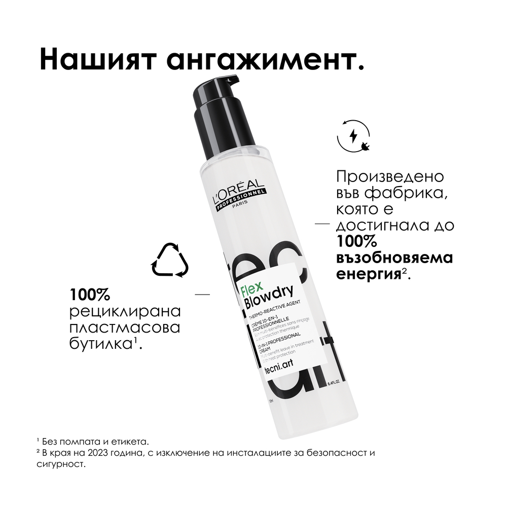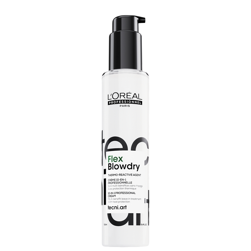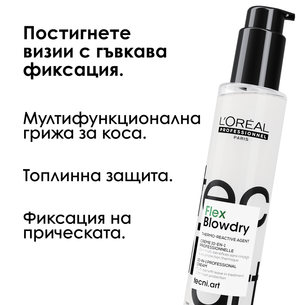 Кремът без изплакване Flex Blowdry осигурява 10 ползи за косата. С формула на основата на растителни протеини в комбинация със 17 аминокиселини, получени от соеви, царевични и пшенични протеини, мултифункционалният крем защитава косата при топлинна обработка до 230°C и я предпазва от фриз ефекта. Улеснява изсушаването и помага за фиксиране на стайлинга за по-дълго време. Осигурява блясък, по-малко накъсване, подхранване, изглаждане и дисциплина за косата. Формулата му се активира при използването на топлинен уред над 150°C.