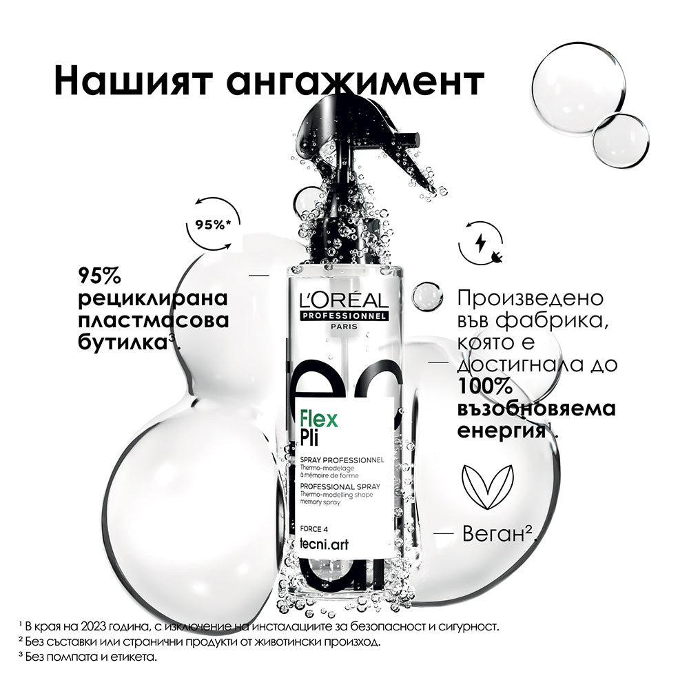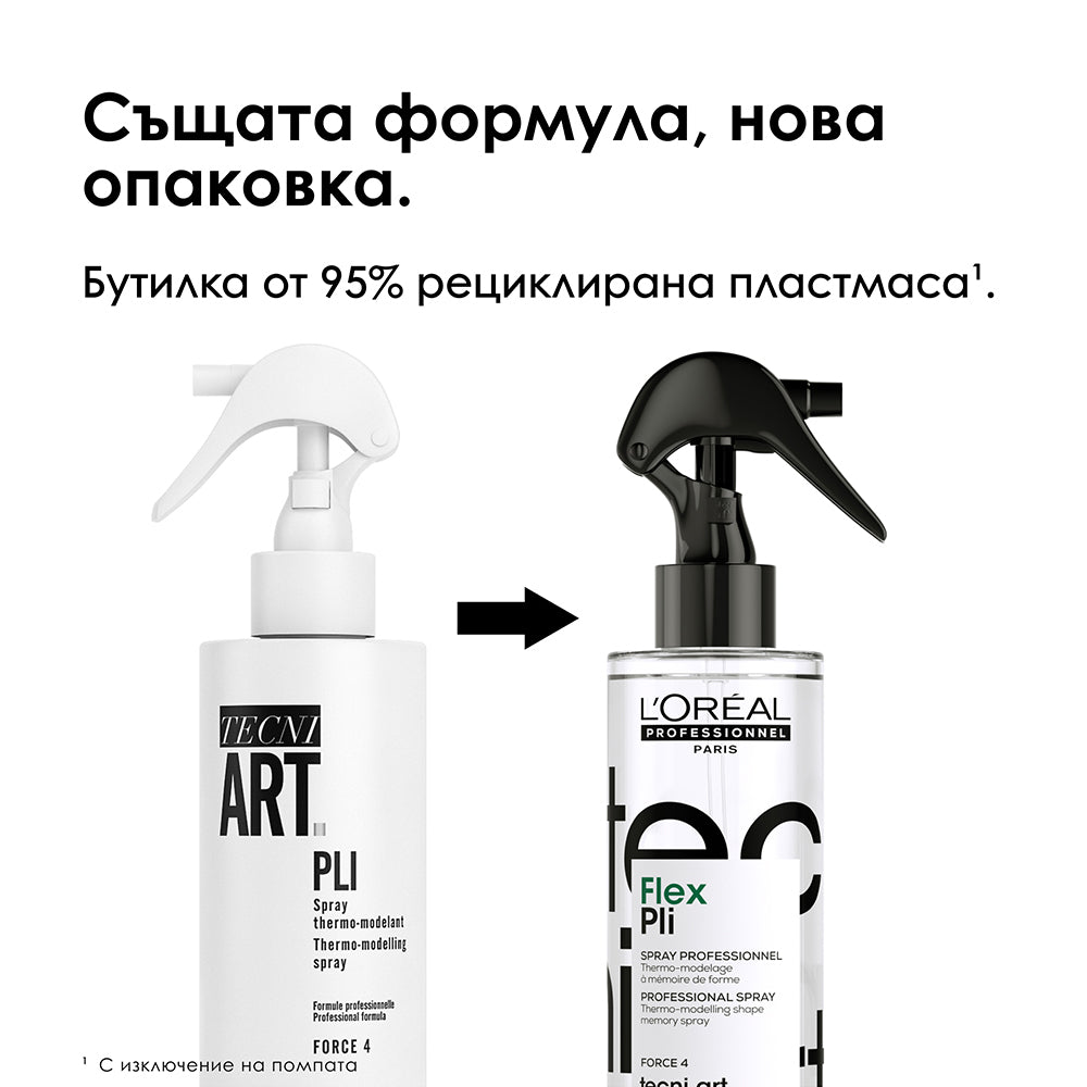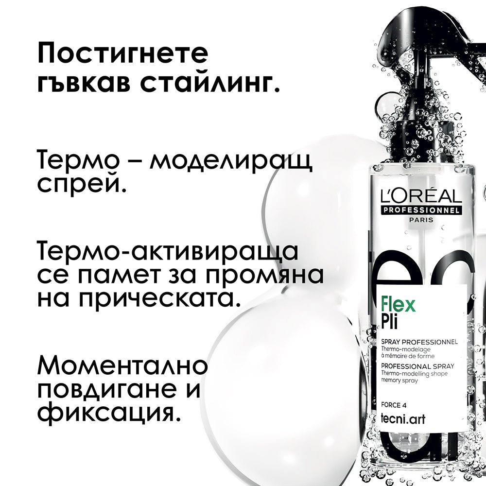 Термо-моделиращ спрей L'Oreal Professionnel Tecni Art Flex Pli, който осигурява моментално повдигане от корените и цялостна обемна визия след изсушаване. Подходящ за оформяне на къдрава и чуплива коса. Запазва формата на прическата и помага за фискирането на къдриците и вълните. Flex Pli може да се използва и като primer преди стилизирането на косата. Постигате моментално повдигане от корените и цялостна обемна визия след изсушаване.