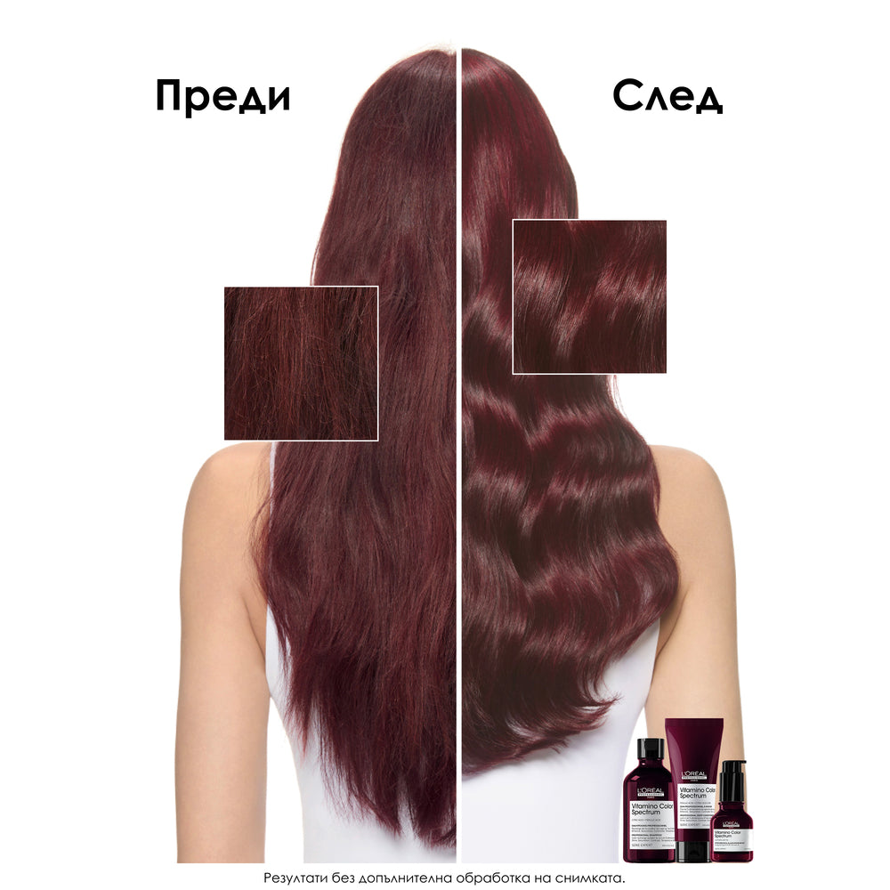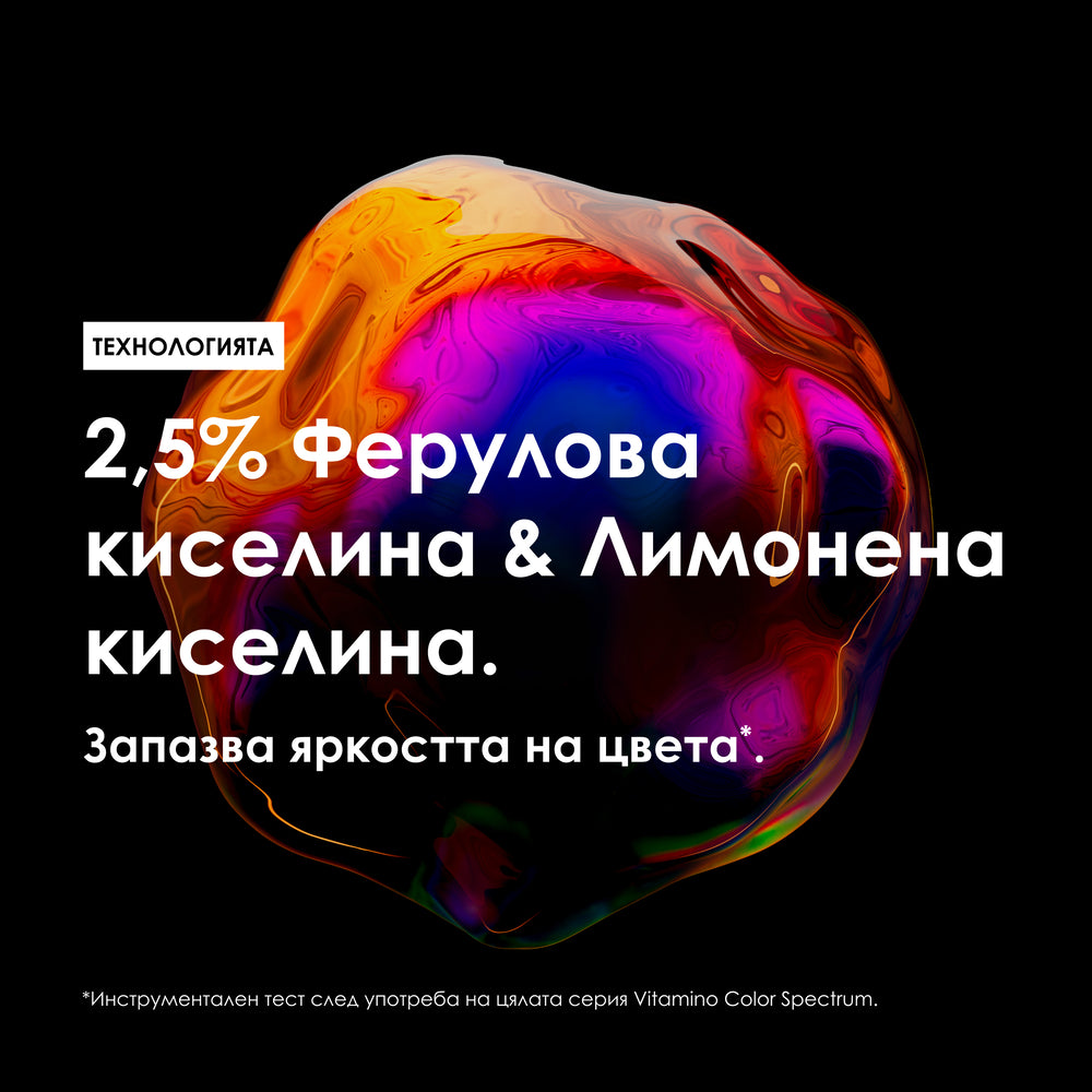 Изменението на 5 измерения на цветовия спектър води до промяна на цвета на боядисаната коса с времето – блясък, наситеност, многоизмерност на цвета, тон и яркост. На първия ден след боядисването косата отразява всички тези цветови измерения, но техният интензитет се променя с течение на времето. Серията Vitamino Color Spectrum, специално създадена за грижа за боядисаната коса и ярките цветове, запазва яркостта на цвета до 100 дни*, както и всички 5 измерения на цветовия спектър*. С нея ще постигнете: повече блясък, богати, наситени цветове, запазване на нюансите на боядисаната коса, постигнати по време на боядисването, и тяхната яркост.