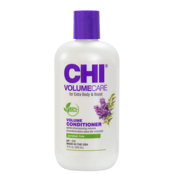 CHI VolumeCare Volumе Conditioner е балсам за обем с 92% естествени съставки, специално създаден за тънка и фина коса. Придава допълнителен обем от корена до върха, без да утежнява и максимално улеснява разресването. Притежава уплътняващ ефект, който действа като мощен бустер за обем и придава усещане за двойно повече коса. Формулата с алое вера и люляк осигурява оптимални нива на хидратация, придава еластичност, копринена гладкост и невероятен блясък. Регенерира и укрепва космените фоликули, като насища косата с основни хранителни вещества. CHI VolumeCare Volumе Conditioner съдържа копринени протеини, които осигуряват увеличаване на плътността и еластичността на всеки косъм. Косата е ревитализирана, с подобрена текстура, жизнена и плътна.