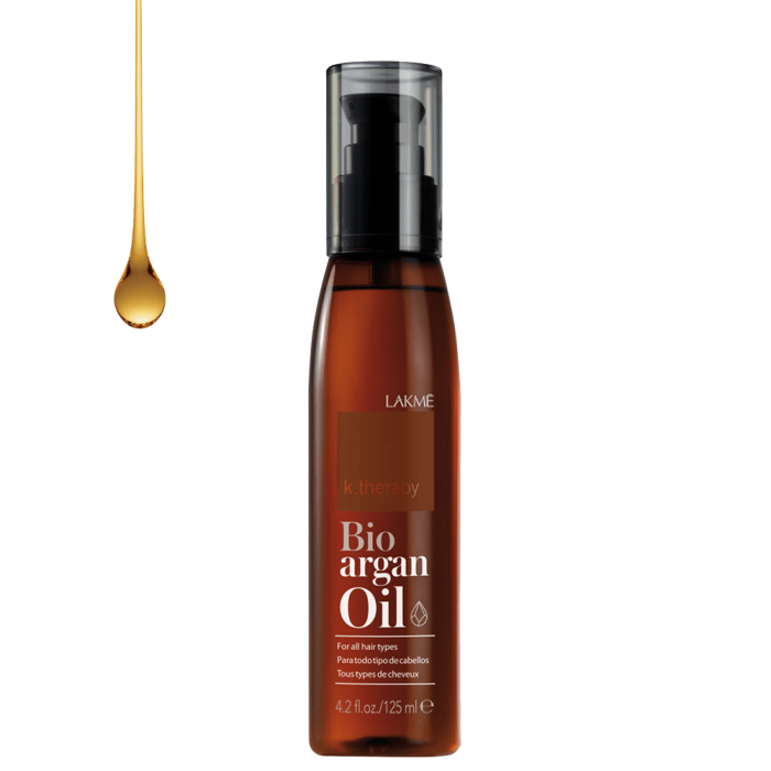 Притежава мощни хидратиращи и подхранващи свойства, без да утежнява. Богато на витамин Е, Омега 3 и 9 мастни киселини, „течното злато“ на Мароко, както го наричат, действа като магическа пръчица при цъфтящи краища и накъсване. Причината стилистите да сравняват олиото LAKME K.therapy Bio Argan Oil с блясък за устни е, че запечатва влагата вътре в косъма, без да утежнява. „Сухата“ му текстура изключва всякакъв намек за мазен филм. Освен това косата го абсорбира 4 пъти по-бързо от кожата и ноктите.