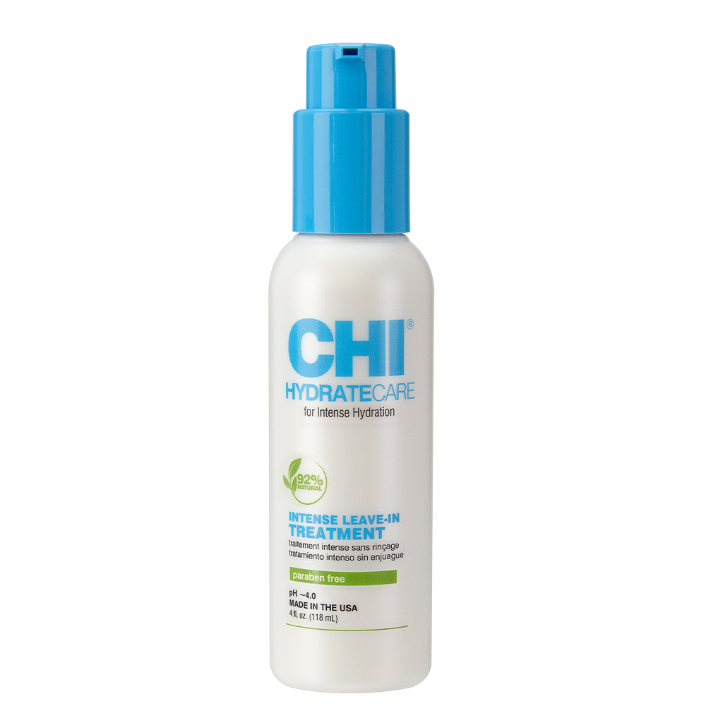 Интензивна хидратираща терапия без отмиване CHI HydrateCare Intense Leave-In Treatment възстановява и заздравява сухата и изтощена коса, като стабилизира нивата на хидратация вътре в косъма и подхранва в дълбочина. Предпазва от накъсване и увреждане, интензивно хидратира и укрепва структурата на косата. Повишава еластичността, придава копринена мекота и изключителен блясък. Изглажда, помага за лесно разресване и възстановява жизнения вид и силата на косата. Лека формула с 92% естествени съставки.