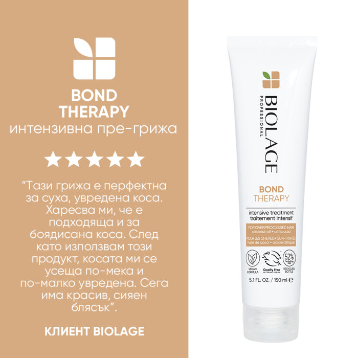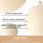 Серията Bond Therapy от интензивна грижа, шампоан и балсам осигурява възстановяване на здравината, изглаждане, блясък, възстановяване на накъсаните краища само в 1 употреба. Bond Therapy помага да се изгради мрежа от слаби връзки в косъма след 6 нанасяния на шампоана и балсама.