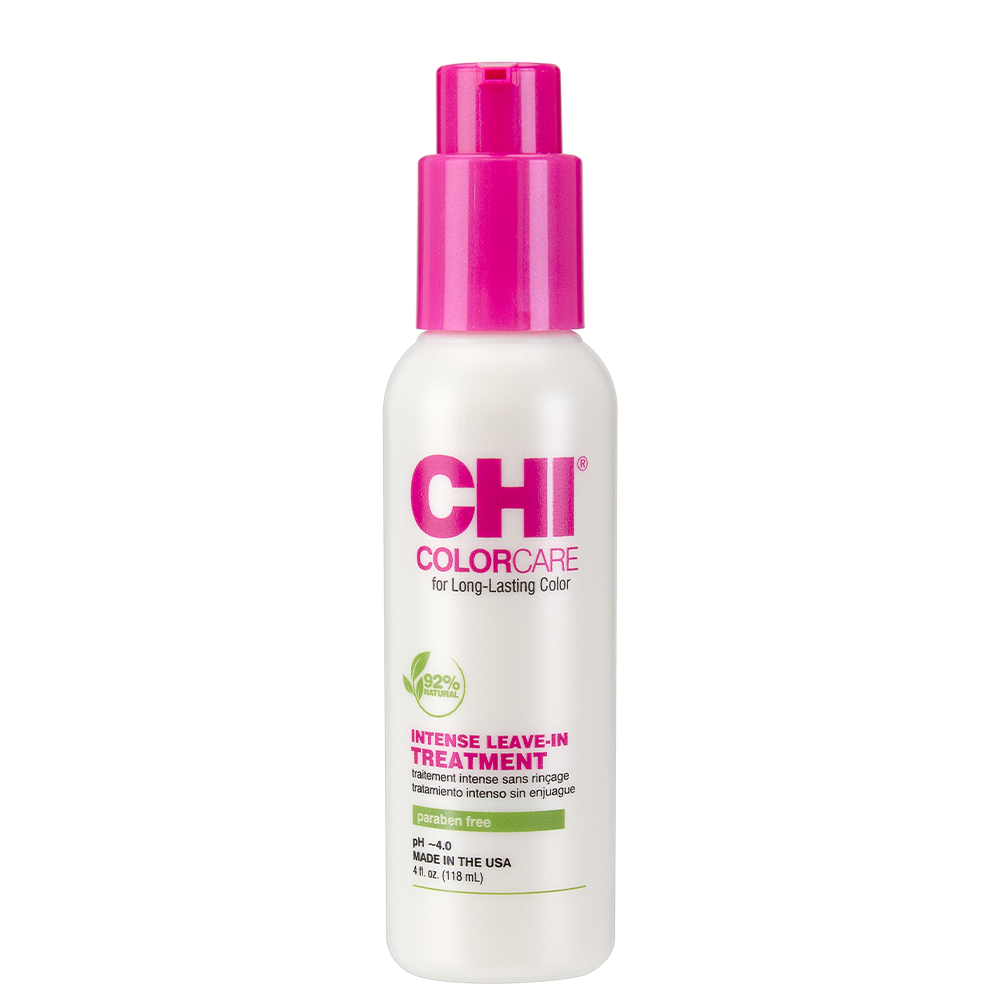Интензивна терапия за запечатване на цвета на боядисана коса без отмиване CHI ColorCare Intense Leave-In Treatment възстановява и заздравява третираната коса, осигурявайки хидратация и подхранване в дълбочина. Фиксира пигментите в косъма, като по този начин запазва цвета ярък и жизнен за по-дълго време. Предпазва от накъсване и увреждане и запечатва краищата. Контролира фриз-ефекта и помага за лесно разресване, като изглажда и защитава от влагата във въздуха. Повишава еластичността, придава копринена мекота и изключителен блясък. Лека формула с 92% естествени съставки.