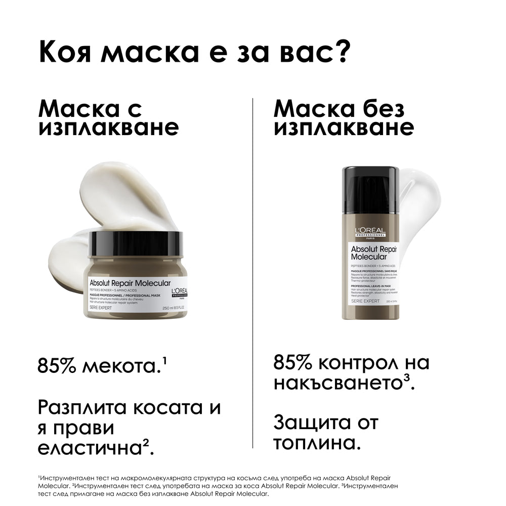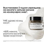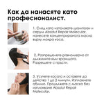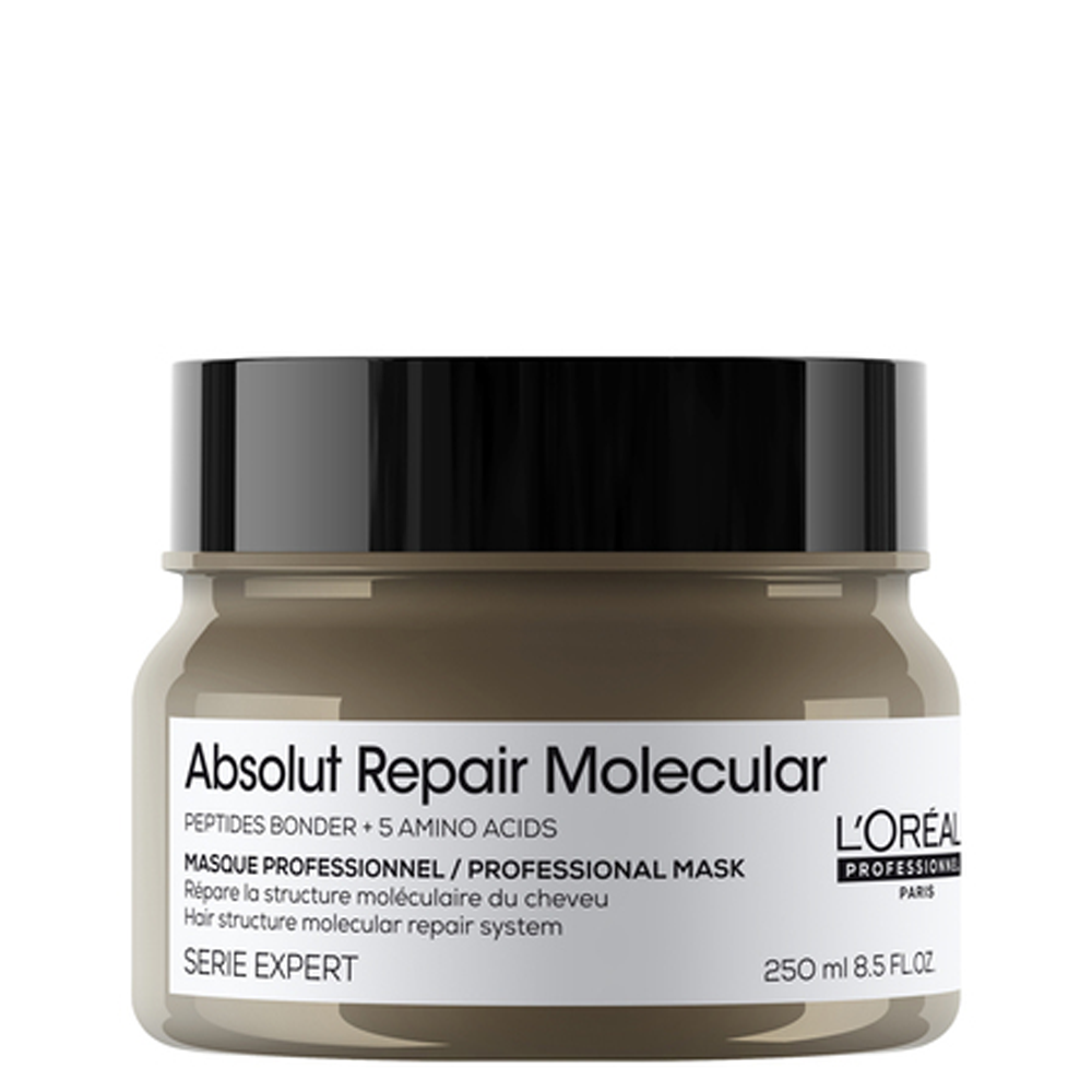Професионална концентрирана маска Absolut Repair Molecular Mask, обогатена със система за защита на пептидните връзки и 5 aминокиселини, която запълва и укрепва косата. Възстановява 2 години увреждане на косата*. Запълва косъма на молекулярно ниво**.