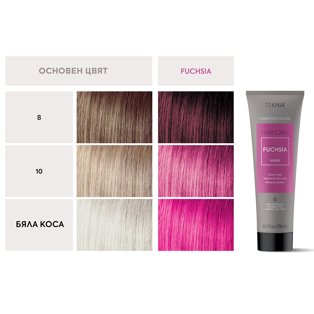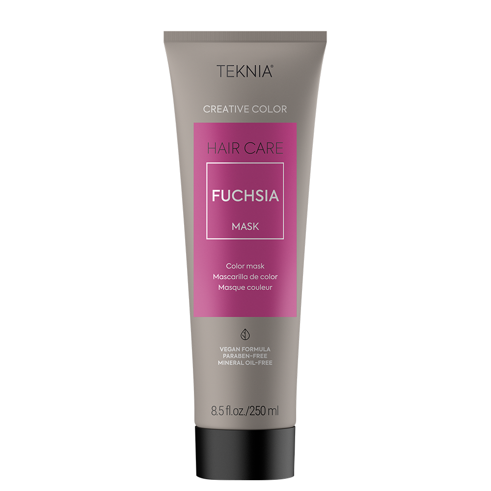 Оцветяваща маска за коса в цикламени тонове LAKME TEKNIA Creative Color Fuchsia Mask помага за създаване на дръзка визия в цвят фуксия. Ефектът е по-наситен върху руса и изсветлена коса. Съдържа органично масло от моринга, което има антиоксидантни и подхранващи свойства. Възстановява в дълбочина и защитава косъма, като попълва липсващия кератин и реструктурира увредените участъци. Омекотява косата и придава блясък. Резултатът е интензивен, сияен цвят и копринено мека коса.