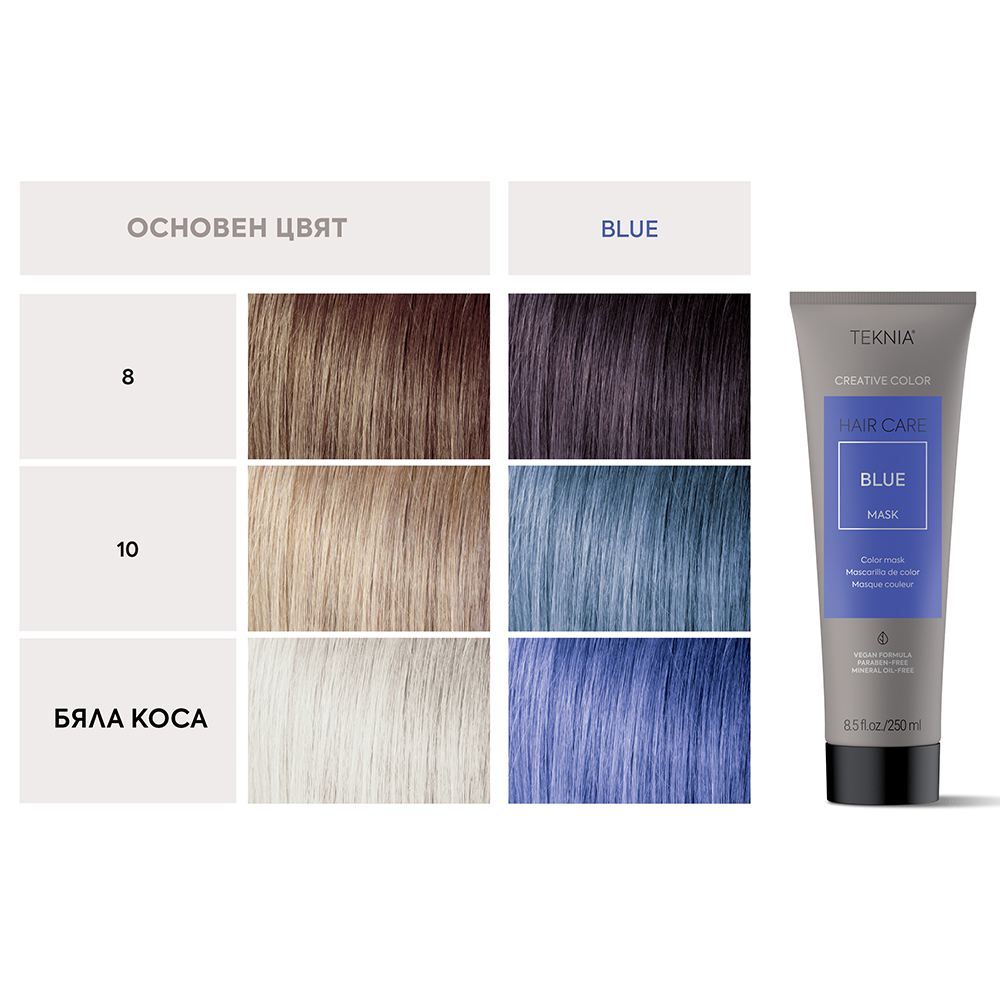 Оцветяваща маска за коса в сини тонове LAKME TEKNIA Creative Color Blue Mask помага за създаване на дръзка визия в металически, тъмносин цвят. Ефектът е по-наситен върху руса и изсветлена коса. Съдържа органично масло от моринга, което има антиоксидантни и подхранващи свойства. Възстановява в дълбочина и защитава косъма, като попълва липсващия кератин и реструктурира увредените участъци. Омекотява косата и придава блясък. Резултатът е интензивен, сияен цвят и копринено мека коса.