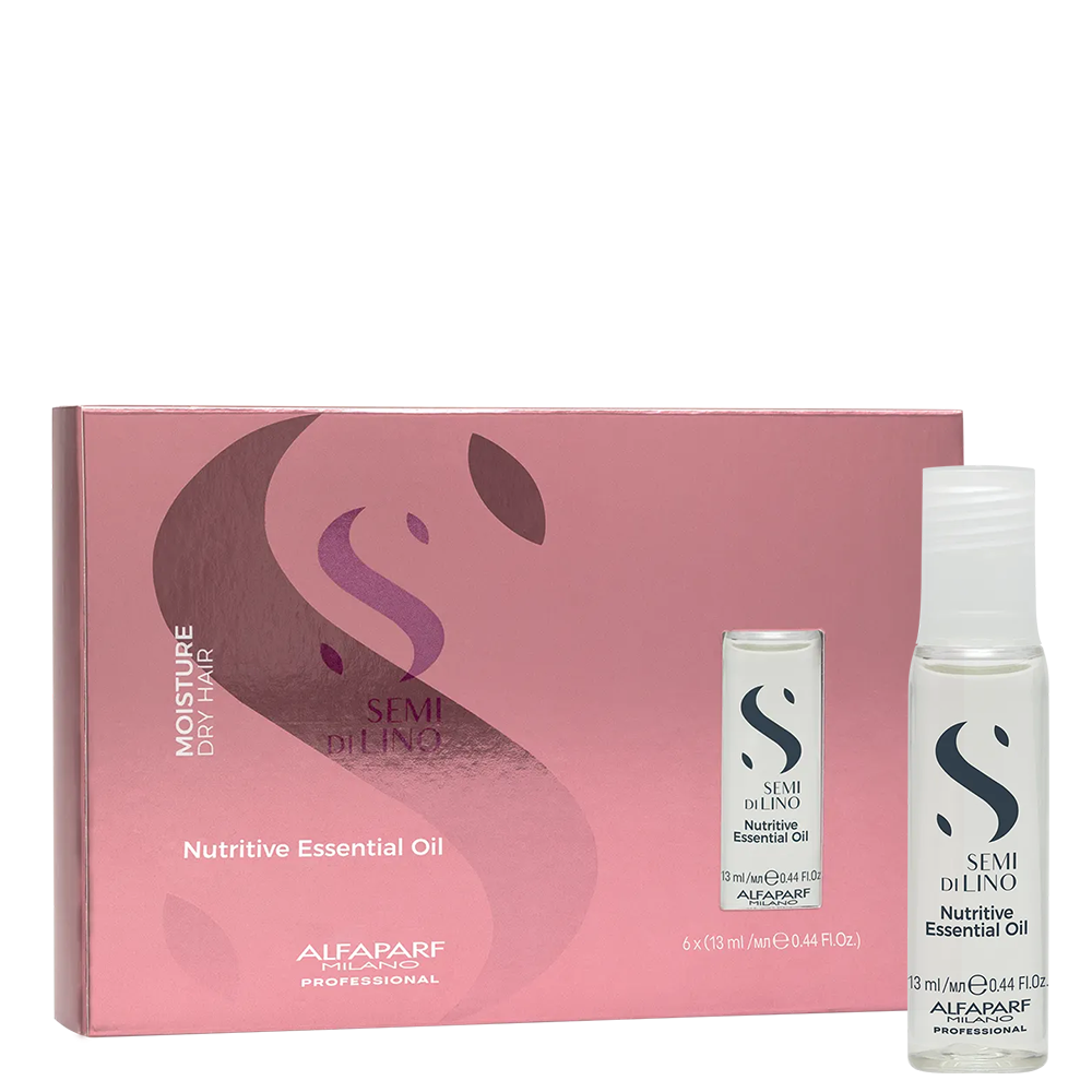 Alfaparf Nutritive Essential Oil съдържа комплекс за блясък, богат на ленено семе, мастни киселини, омега 3 и омега 6. Затваря фибрата на косъма и осигурява изклителен блясък от корена до върха.