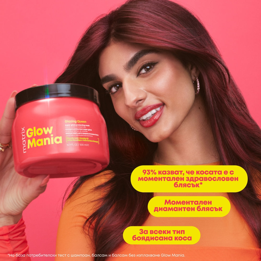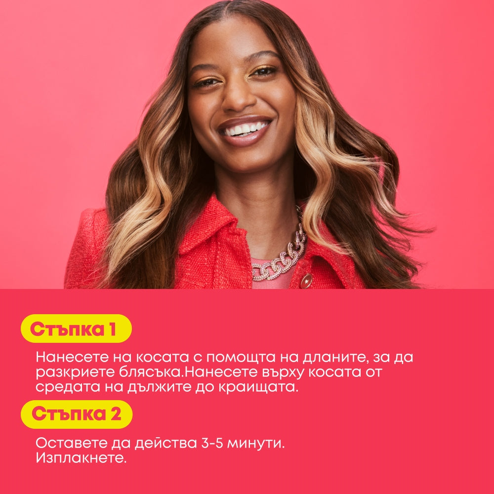 Предпазваща маска за интензивен блясък, подходяща за боядисана коса или коса с липса на блясък. Обогатена е с гликолова киселина, най-малката алфа-хидрокси киселина, и масло от шипка за дълготраен блясък. Ламинира косъма за по-добро отразяване на светлината и помага за предпазване от избледняване на цвета на боядисаната коса. Осигурява ламиниране на косата, за подобряване на блясъка на цвета за 8 седмици*.