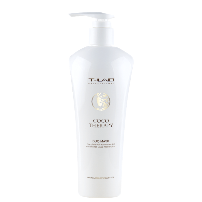 Регенерираща маска за коса и скалп с кокос T-LAB Coco Therapy Duo Mask предлага пълна реконструкция на косата и интензивно подмладяване на скалпа. Подходяща за всеки тип коса, тя заздравява скалпа и предотвратява накъсването и увреждането. Формулирана с уникален натурален комплекс, базиран на сертифицирани органични съставки, маската подхранва в дълбочина и възстановява вътрешната структура на косата. T-LAB Coco Therapy Duo Mask прави косата по-плътна и добре поддържана. Прави косата по-еластична и гладка с възстановен скалп и усещане за свежест, като след професионална грижа във фризьорски салон. Съдържа 98,7% натурални съставки.
