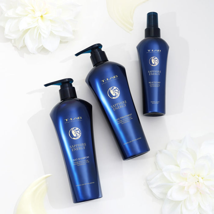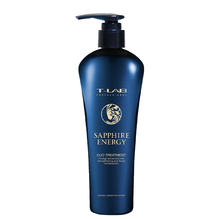 Ревитализираща маска за коса T-LAB Sapphire Energy Duo Treatment подхранва, възстановява, хидратира и подобрява еластичността на косата. Подходяща за всеки тип коса, особено зряла, изтощена и суха коса, която се нуждае от интензивна ревитализация и анти-ейдж грижа. Формулирана с растителни екстракти и сертифицирани органични съставки, които възвръщат виталността и красивия сияен блясък и на най-изтощената коса. Обогатена със скъпоценна сапфирена пудра, пептиди и екстракт от бакучиол, маската преобразява косата, още след първото нанасяне.