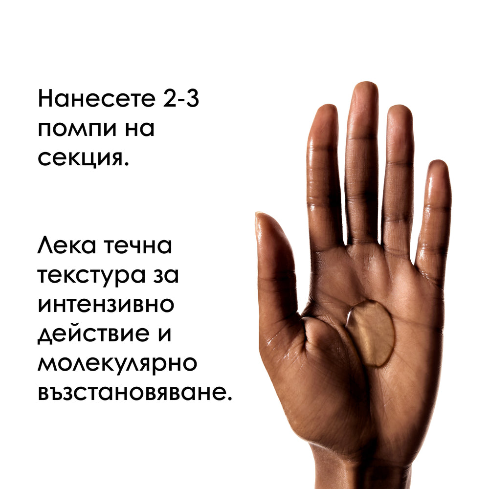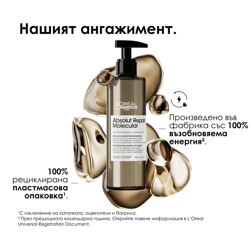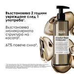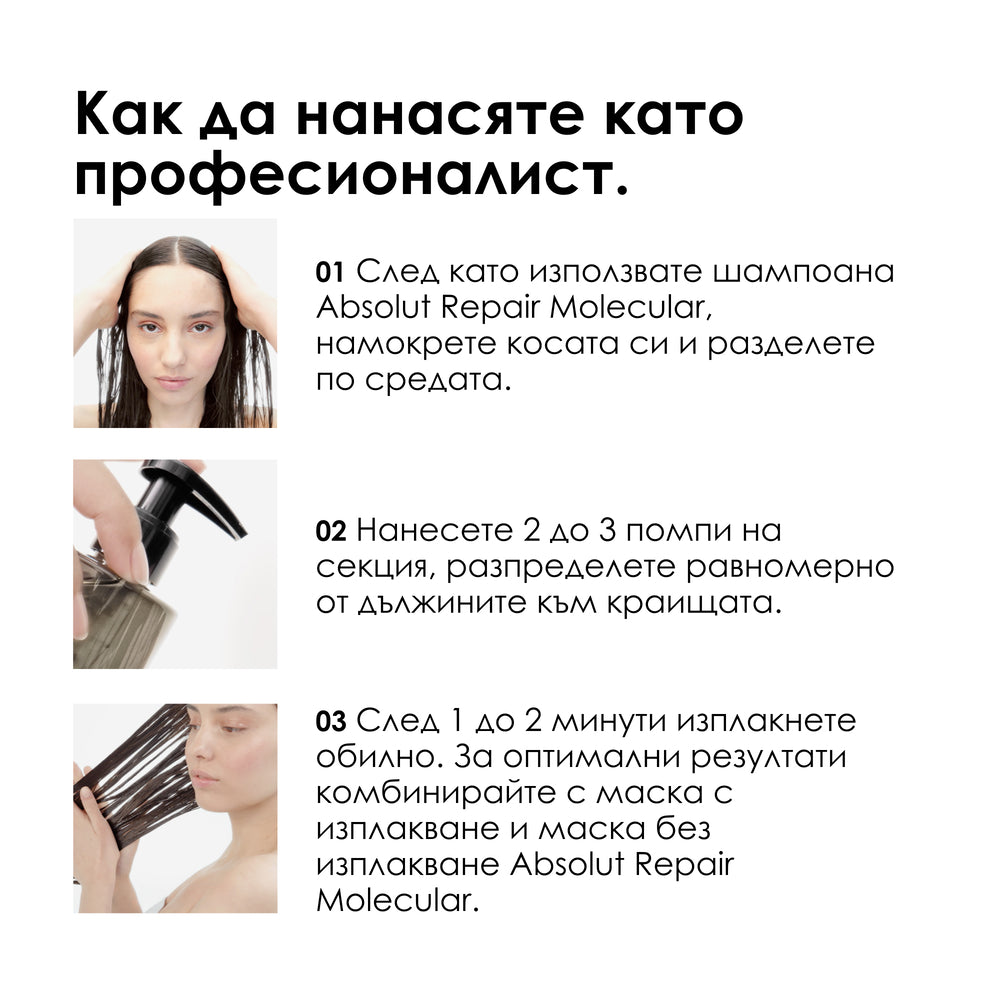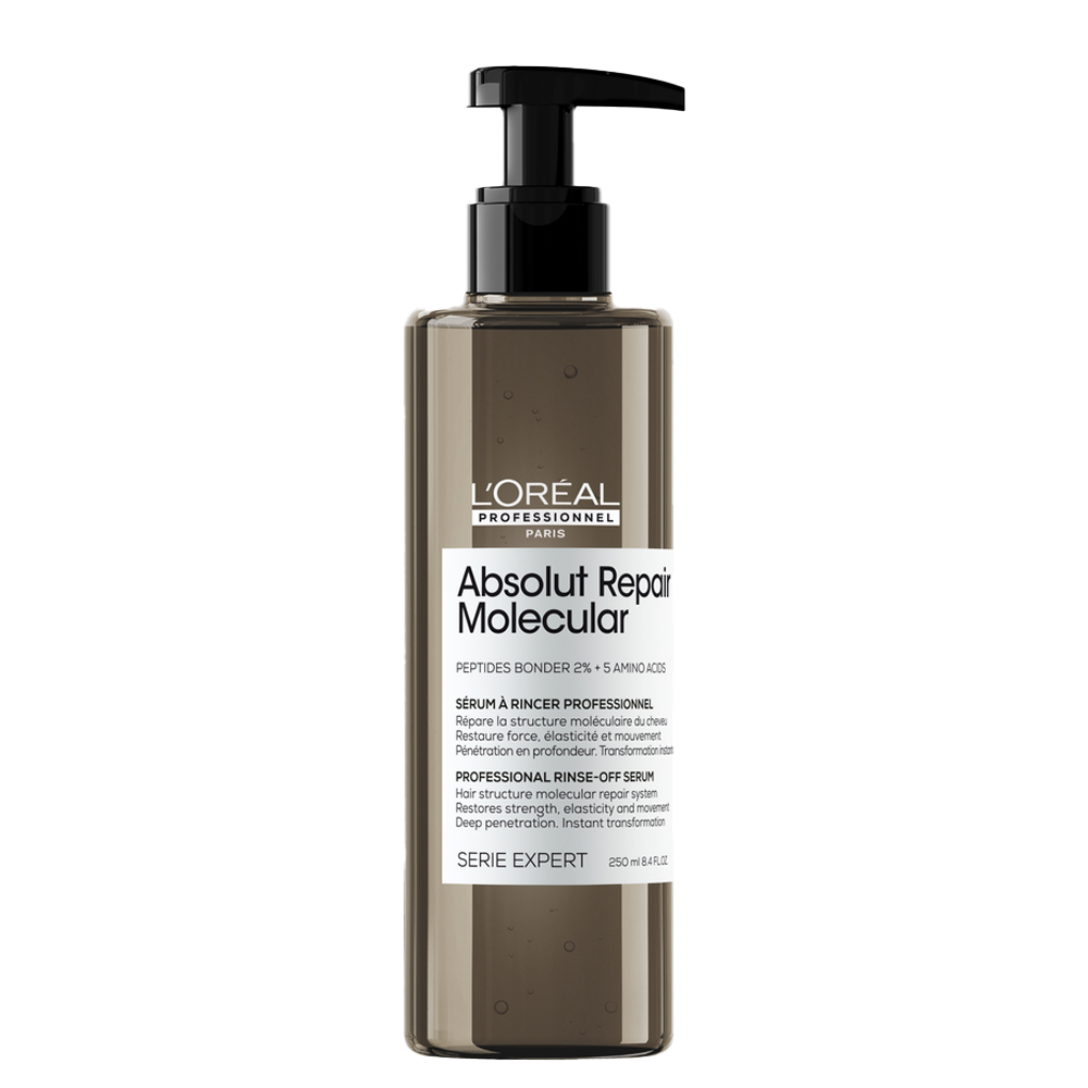 Серум с изплакване за увредена коса Absolut Repair Molecular Rinse-off Serum, който действа като маска, обогатен с 2% система за защита на пептидните връзки и 5 аминокиселини. Осигурява възстановяване на молекулярната структура на косата чрез възстановяване на слабите връзки в косъма*, а това означава повече от повърхностно възстановяване – укрепва вътрешността на косъма на молекулярно ниво. Вдъхновен от мощните серуми за грижа за кожата, той действа интензивно на косъма, за да възстанови здравината на молекулярно ниво**. Възвръща еластичността и свободното движение**. Косата е видимо преобразена, блестяща и гладка.