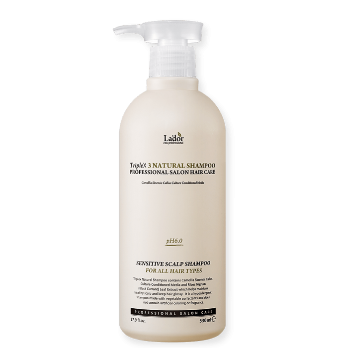 Шампоанът Lador Triplex3 Natural Shampoo почиства косата и успокоява скалпа. Съдържа стволови клетки от зелен чай с успокояващи и антиоксидантни свойства, както и екстракт от касис, който е богат на мастни киселини и осигурява на косата влага. Екстрактът от куркума успокоява скалпа и регулира производството на себум, като едновременно с това освежава.