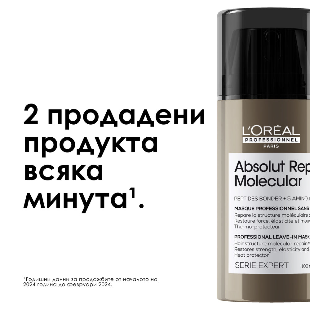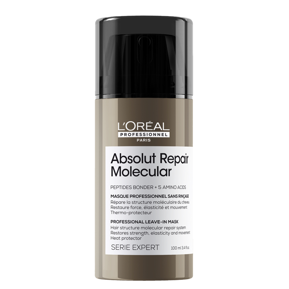 Маска без изплакване за увредена коса Absolut Repair Molecular Leave-in Mask e с бързо абсорбираща се кремообразна текстура и система за защита на пептидните връзки, обогатена с аминокиселини. Осигурява термозащита, подсилва косата и придава блясък. Продуктът е формулиран със система за защита на пептидните връзки и 5 аминокиселини за възстановяване на молекулярната структура на повърхността на косъма*. Леката текстура прониква мигновено и възстановява силата на косата. Косата е с подобрена еластичност и се движи свободно**.