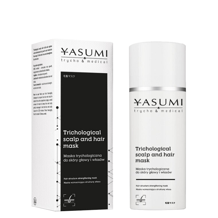 Yasumi Trichological Scalp and Hair Mask с чили и аргинин стимулира растежа на косата и хидратира. Намалява косопада и укрепва структурата на косъма. Съдържа цетримониев хлорид, който изглажда косъма и улеснява разресването. Маслото от бадем предпазва от изсушаване, прави косъма подхранен и бляскав. Екстрактът от люта чушка помага за подобряването на микроциркулацията и стимулира растежа на космените фокликули. Има стягащи, антибактериални и себорегулиращи свойства. Коренът от джинджифил има благоприятен ефект върху функционирането на кожата, включително скалпа. Помага на активните вещества да проникват по-добре в космения фоликул, укрепва отслабената и падаща коса.