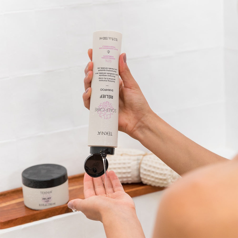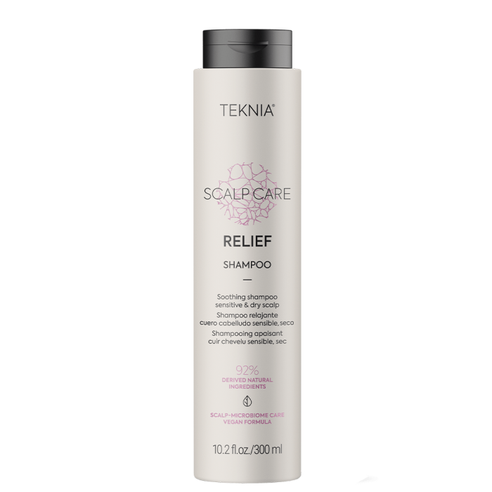 LAKME TEKNIA Scalp Care Relief Shampoo е безсулфатен мицеларен шампоан с интензивно успокояващо, възстановяващо и хидратиращо действие върху сухия и чувствителен скалп. Ефективната му формула, постигната в лабораториите на LAKME, е комбинация от ефективни съставки за третиране на хиперреактивност и нетолерантност, характерни за много чувствителния и свръхчувствителния скалп. Осигурява незабавен и дълготраен успокояващ ефект върху реактивната на кожа на главата и намалява значително чувствителността и зачервяванията.
