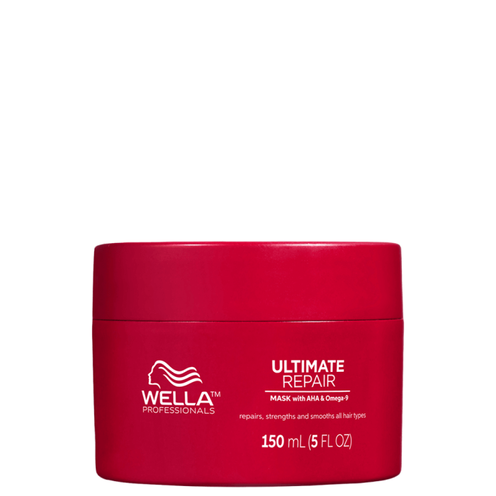 Възстановяваща маска за увредена коса Wella Professionals Ultimate Repair Mask подхранва, възстановява и интензивно омекотява увредената, изтощена и суха коса. Формулата на маската с AHA, Омега-9 и биоидентични липиди осигурява възстановяване и попълване на косъма в дълбочина. В резултат, косата е гладка, мека и с блясък.