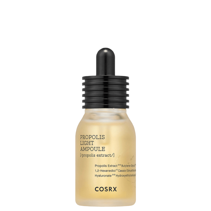 Cosrx Full Fit Propolis Light Ampoule е ампула за лице с 83,25% екстракт от прополис, която озарява, осигурява дълготрайна хидратация и възвръща младежкия вид на кожата. Съдържа естествени хидратиращи съставки, витамин B5, които изравняват текстурата.