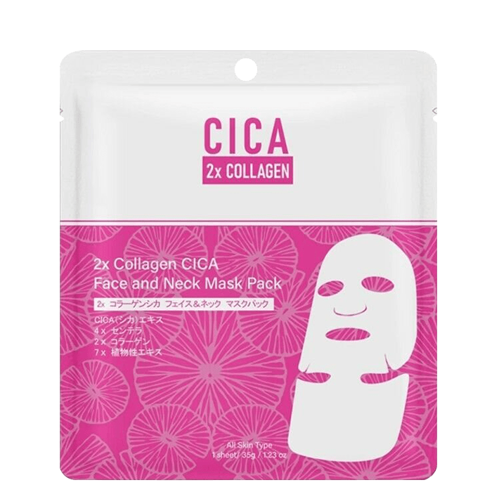 Mitomo CICA 2x Collagen Face and Neck Mask Pack е маска за подмладяване на кожата на лицето и шията с изглаждащ ефект. Серумът на маската подобрява цвета и текстурата на кожата, увеличава производството на колаген и еластин, бори се с признаците на стареене и озарява.