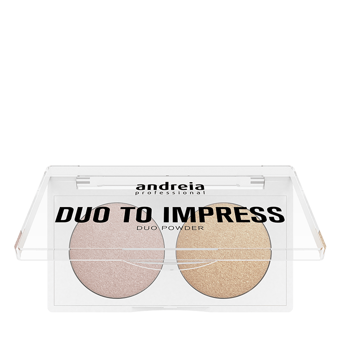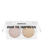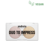 Дуо хайлайтъри Andreia Professional Duo to Impress Highlighter в два нежни нюанса - Gold и Rose. Нежната текстура деликатно подчертава акцентите в контура на лицето. Позволява комбиниране на двата нюанса или използане поотделно, според желания завършек. Подчертава красивите детайли и придава завършен вид на визията. Кожата засиява в изкусителни блестящи акценти, за да постигнете озарена и женствена визия. Нежната веган формула деликатно подчертава кожата в продължение на часове.