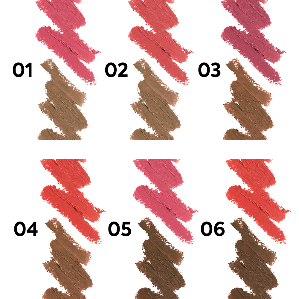 Предлага се в шест зашеметяващи цветови комбинации, всяка с уникални нюанси на руж и контур.