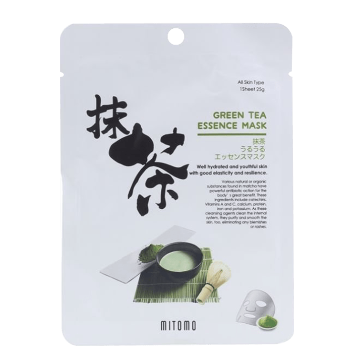 Mitomo Green Tea Essence Mask има изсветляващо и избелващо действие върху кожата на лицето, благодарение на екстракта от японски зелен чай матча. Матчата съдържа различни органични вещества, които имат мощно антибиотично действие – катехини, витамин A и C, калций, протеини, желязо и калий. Почистват и изглаждат кожата, оставяйки я хидратирана и мека. Матчата може да потисне активността на тирозиназата и каталазата, които причиняват птъмняването на кожата, образуването на лунични и кафяви петна.Шийт маската е с най-високо качество и е изработена от натурални растителни фибри от бамбук.