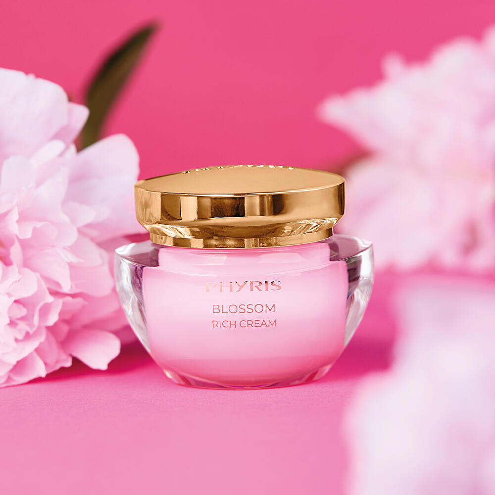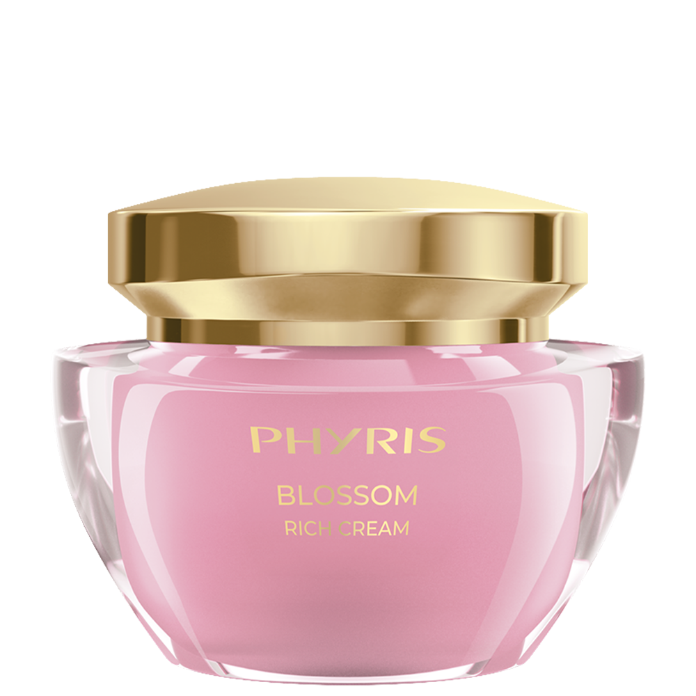 PHYRIS BLOSSOM Rich Cream е изглаждащ и подмладяващ крем, който възвръща младежкия вид на кожата, хидратира я и намалява признаците на стареене като фини линии и бръчки. Забавя стареенето на кожните клетки и подобрява цялостно текстурата. Съдържа екстракт от ружа, божур, ниацинамид и масло от камелия.