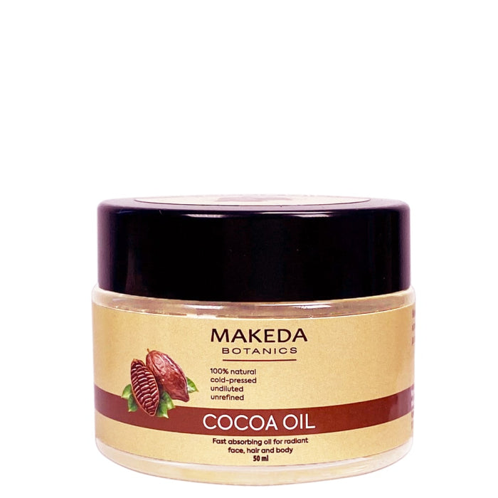 Чистото масло на Makeda Botanics от какао е богато на антиоксиданти и витамин Е, които предпазват кожата от вредните външния влияния и по този начин забавят клетъчното стареене. При редовна употреба изглажда бръчките и фините линии и придава на кожата загладен и по- младежки вид. Маслото се втечнява бързо при досег с кожата, абсорбира се лесно и я хидратира, правейки я копринено мека на допир. Какаовото масло е подходящо за всеки тип кожа и помага за образуването на естествен и равномерен тен.