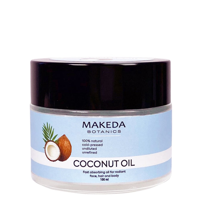 Чистото масло на Makeda Botanics от кокос е с приятен, тропически аромат на кокосов орех, попива лесно в кожата и косата, което го прави много лесно и удобно за приложение. Със своите антибактериални и противовъзпалителни свойства доказано облекчава кожните раздразнения и се бори с акнето. Придава блясък на косата и намалява накъсването. Структурата му от средноверижни мастни киселини прониква лесно в косъма, поддържайки необходимите нива на хидратация и възстановява увредената коса.