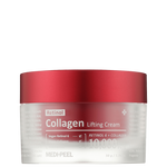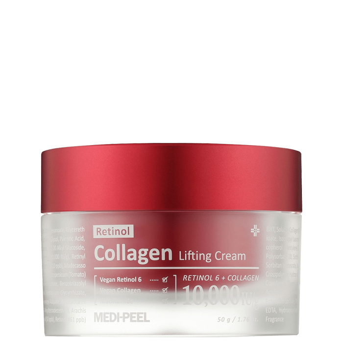 Medi-Peel Retinol Collagen Lifting Cream е лифтинг крем за лице, който съдържа комплекс от 6 вида ретинол и колаген за намаляване на бръчките и стягане на контура на лицето. Комплексът от ретинол е с чист ретинол, растителен ретинол и функционален ретинол заличават признаците на стареене. Ретинолът се съдържа в капсули с наноразмер, които улесняват проникването в кожата и увеличават максимално доставянето на активни съставки. Съдържа 81% екстракт от растението Anastatica Hierochuntica, което хидратира кожата ефективно и в дълбочина, подпомага повишаването на еластичността и изглаждането на текстурата на кожата. Ниацинамидът помага за видимото намаляването на порите и тяхното стягане, изравнява тена, омекотява и се бори с фините линии и бръчките.