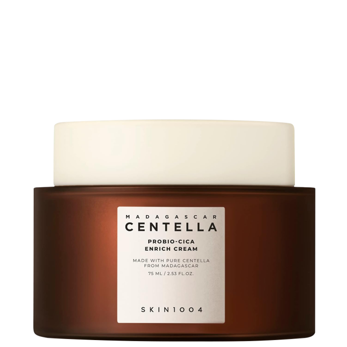 SKIN1004 Madagascar Centella Probio-Cica Enrich Cream е крем за лице с азиатска центела, лактобацилус, серамиди, 2% ниацинамид, масло от семена на макадамия и моринга. Подпомага възобновяването и защитава липидната бариера на кожата, възстановява, успокоява и стяга. Разтегливата като конец формула превръща нанасянето в ритуал!