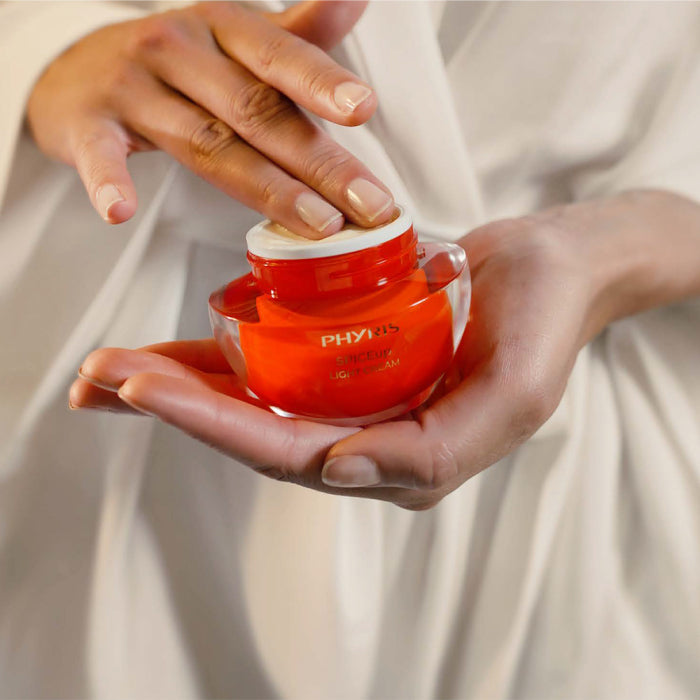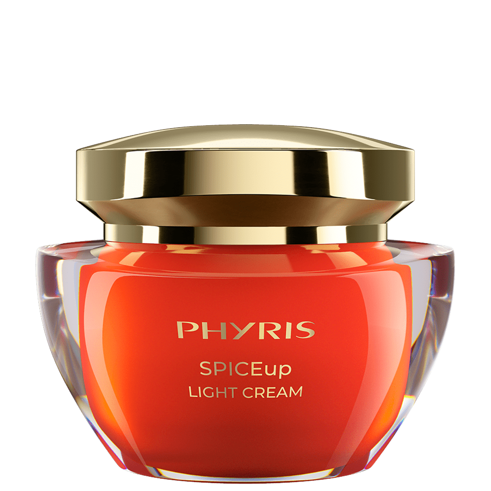 PHYRIS SPICEup Light Cream е хидратиращ крем с луксозна лека текстура, формулиран с екстракт от къри, сечуански пипер и какаово масло. Има хидратиращ и изглаждащ ефект, подобрява състоянието на кожата, като повлиява положително мимическите бръчки и увеличава еластичността на кожата, стягайки контура на лицето. Екстрактите от къри, сечуански пипер, масло от черен кимион и какаово масло хидратират кожата и изглаждат линиите, като едновременно с това оптимизират усвояването на съставките от последващите продукти и помагат за отпускането на мимическите бръчки. Всички продукти от серията SPICEup са разработени да действат в перфектна хармония. Могат да бъдат използвани самостоятелно или в комбинация – за да поемете на своето персонализирано пътешествие в света на PHYRIS!