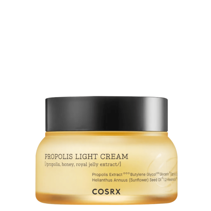 Cosrx Full Fit Propolis Light Cream е лек крем с 65,69% Full Fit Pro-Barrier Complex за хидратиране и подхранване на кожата. Комплексът Full Fit Pro-Barrier съдържа екстракти от черен пчелен прополис, мед и пчелно млечице, които доставят на кожата наситено подхранване и хидратация.