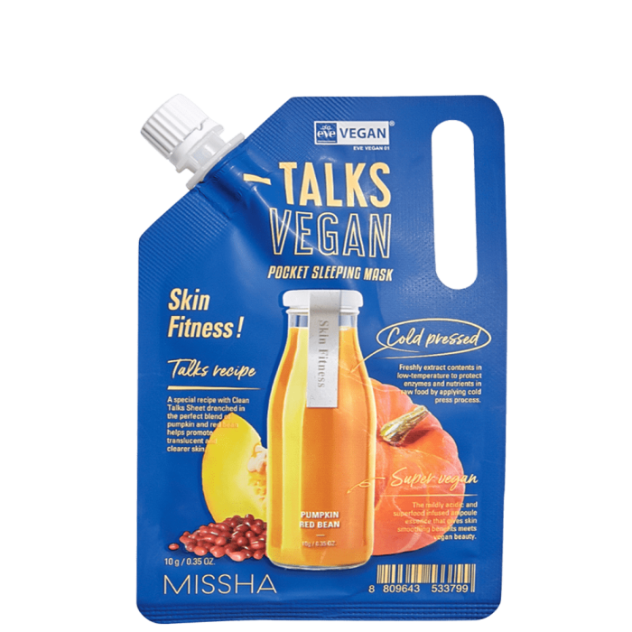MISSHA Talks Vegan Squeeze Pocket Sleeping Mask Skin Fitness е веган нощна маска за лице, хидратира в дълбочина, изравнява тена, подобрява ексфолиращите процеси в кожата и предотвратява слънчевите увреждания. Съдържа комбинация от 82% студено пресовани тиква и червен боб.
