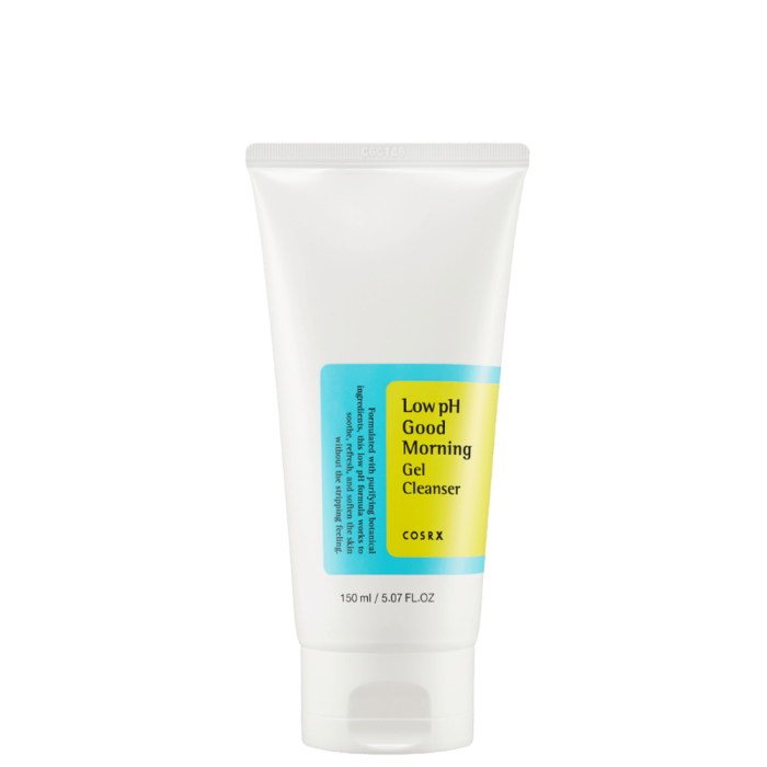 COSRX Low pH Good Morning Gel Cleanser е нежна почистваща пяна с ниско pH, която премахва замърсяванията, остатъците от слънцезащита и грим, като едновременно с това защитава кожната бариера и предпазва от изсушаване. Формулирана с масло от чаено дърво и естествена BHA, които подобряват цялостната текстура и успокояват зачервяванията.