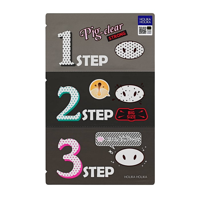 Pig Nose Clear Blackhead 3-Step Kit Strong съдържа 3 ленти за нос, които почистват порите в дълбочина и премахват черните точки. По-големият размер на лентите покрива не само цялата повърхност на носа, но и почиства запушените пори по бузите. Благодарение на допълнителните изрезки лентите лесно заемат правилната позиция, без да образуват гънки. Формулата с въглен и натурални съставки ефективно премахва всички замърсявания, себум и мъртви кожни клетки. Стяга порите, като същевременно успокоява кожата.